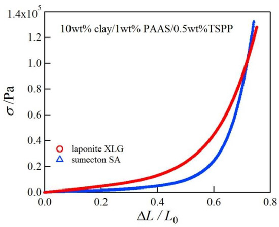 Representative compressive stress–strain curves for 10 wt % laponite/PAAS and 10 wt % sumecton/PAAS blend hydrogels.