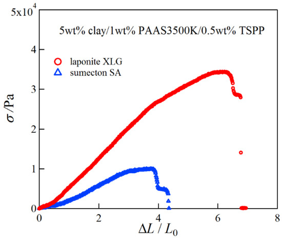 Representative tensile stress–strain curves for 5 wt % laponite/PAAS and 5 wt % sumecton/PAAS blend hydrogels.
