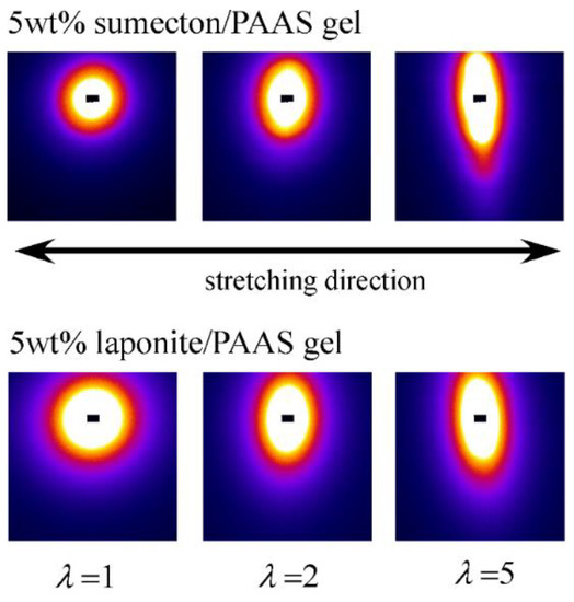 In order to investigate structure of the gels during stretching, synchrotron SAXS experiments were performed. Although the clay/PAAS blend hydrogel is a four-component system and therefore the scattering intensity of the gel is given by the sum of the partial scattering functions between the respective components, in fact the partial scattering function for the clay–clay components is dominant in the X-ray scattering, as mentioned in the previous paper [14]. Namely, we can clearly see the structure of the clay platelets from the SAXS intensity of the gel. This is because the clay platelets are composed of heavier atoms, which have larger X-ray scattering length [17]. Figure 6 depicts two-dimensional patterns for laponite/PAAS and sumecton/PAAS gels during elongation. The SAXS patterns for both gels are isotropic before stretching (see the SAXS pattern at the extension ratio λ = 1), reflecting that the structure is isotropic before stretching, whereas they show elliptic patterns with a longer axis in the vertical direction during stretching. The anisotropic character increased with the increase of the stretching ratio. The elliptic patterns suggest that the clay platelets lie down towards the stretching direction under elongation, considering an inverse relationship between the object size and the scattering angle in scattering theory [19]. As a matter of fact, the scattering intensity for both gels in the perpendicular direction was stronger than that in the parallel direction, as shown in Figure 7 and Figure 8. These results also support the above interpretation. The scattering curves of the sumecton/PAAS gel in the perpendicular direction at high elongation had multiple small peaks or shoulders (Figure 9). The ratio of the peak position was 1:2:3 and the first peak was observed at q ≈ 0.1 Å−1. Thus, sumecton/PAAS gel may be arranged in the perpendicular direction with an interparticle distance of ~6.3 nm at high elongations. Such regular structure may reflect local aggregation of clay platelets in the original state (undeformed state), which contributes to lower the mechanical performance of the gel.