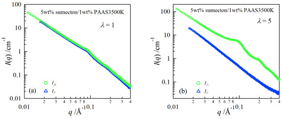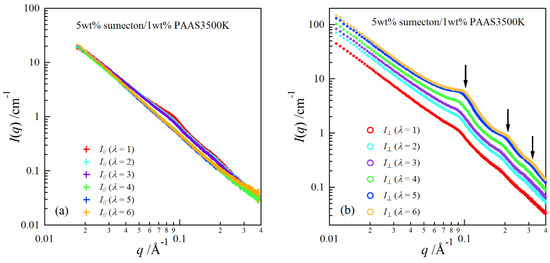 SAXS profiles in the directions parallel and perpendicular to the stretching for a 5 wt % sumecton/PAAS gel at the elongation ratio of 1 (a) and 5 (b).