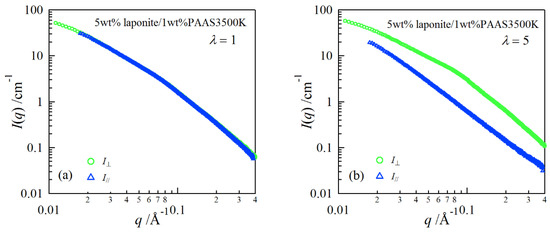 SAXS profiles in the directions parallel and perpendicular to the stretching for a 5 wt % laponite/PAAS gel at the elongation ratio of 1 (a) and 5 (b).