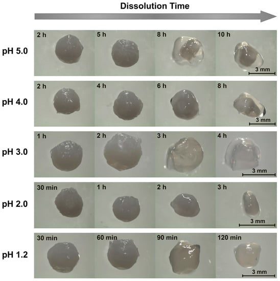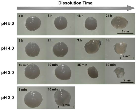 When the experiments were repeated in more acidic, pH 4.0 dissolution media, the dissolution time diminished sharply to approximately 6 h (Figure 2). Here, the beads began to deform and swell after just 3 h of dissolution, and started to become transparent and shrink after 4 h (Figure 1). When the dissolution media pH was decreased to pH 3.0, bead dissolution became even faster (occurring in just slightly over 1 h; Figure 2). The evolution in the bead morphology, however, was different than that in less acidic media. After appearing to remain unchanged over the first 15 min, the beads swelled slightly after 30 min, shrank and became less spherical after 45 min, and became almost flat and flake-like after 60 min (Figure 1).