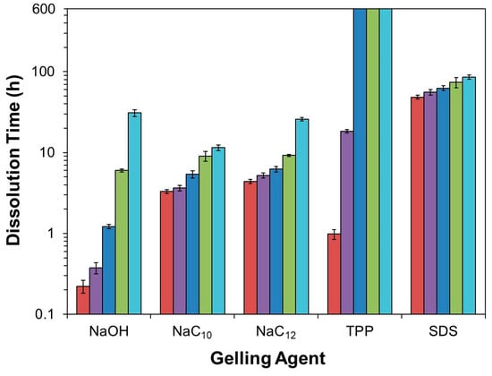 Weak anionic surfactants (NaC10 and NaC12) also generate beads whose dissolution stability is less sensitive to pH than that of beads formed in NaOH and TPP solutions. Due to their weaker binding to chitosan, however, they do not provide as strong of a stabilizing effect as SDS. Indeed, as discussed in Section 2.3, their use as the gelling agent can reduce bead stability in weakly acidic media (as seen at pH 5.0), and could perhaps be used as a strategy to accelerate (rather than decelerate) bead dissolution under these conditions. Conversely, uncrosslinked chitosan beads (obtained by gelling chitosan in alkaline solution) remain stable for hours in mildly acidic solutions, but dissolve within minutes in highly acidic conditions. Since acid and enzymatically catalyzed hydrolysis of highly deacetylated chitosan (such as used in this work) is expected to be slow [,,], bead stabilities over timescales ranging from minutes to multiple days (or even weeks/months) can likely be achieved through a judicious selection of supramolecular gelation pathways.