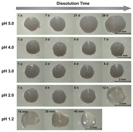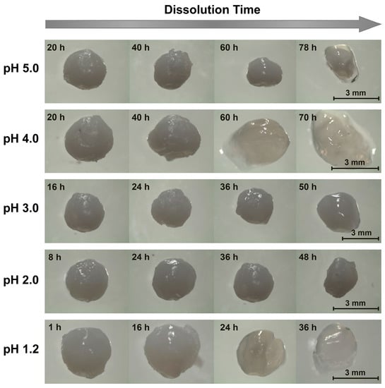 Representative images of alkaline solution-derived chitosan beads dissolving in pH 1.2–5.0 aqueous solutions ([NaCl] = 10 mM).