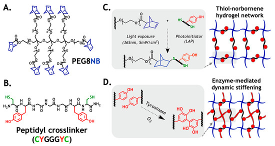 Design principle of the enzyme-mediated hydrogel stiffening: (A) structure of 8-arm PEG-norbornene (PEG8NB, 20 kDa, n ~ 56); (B) structure of an example peptide crosslinker (i.e., CYGGGYC); (C) schematic of thiol–norbornene photopolymerization to form primary hydrogel network; (D) schematic of enzyme (Tyrase)-catalyzed DOPA dimer formation, which leads to dynamic hydrogel stiffening.