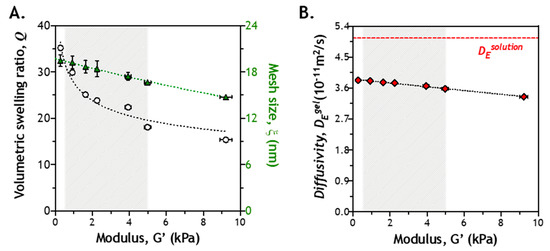 Hydrogel crosslinking density has a significant impact on the diffusion of soluble molecules in the network [32]. More specifically, mesh size of a gel network is the primary factor determining diffusivity of any solute in a highly swollen hydrogel. During the process of enzyme-mediated gel stiffening, hydrogel crosslinking density increases not only with time, but may also vary spatially. Consequently, the diffusivity of Tyrase may be impacted by the stiffening network. The diffusivity of any solute in a highly swollen hydrogel can be estimated by the classical Lustig–Peppas relationship, which describes solute diffusivity (i.e., DEgel) using a correlation of hydrodynamic radius of the solute (RE), mesh size of the network (ξ), and the diffusivity of the solute in a solution (see Section 3.3). Many of these parameters can be obtained from the literature or be determined experimentally. To gain insight into the impact of gel crosslinking on enzyme diffusion in hydrogels, we prepared hydrogels with different macromer compositions that led to varying shear moduli (G’ ~0.5 to ~10 kPa). At any given formulation (and modulus), the mass (q) and volumetric (Q) swelling ratio, as well as the corresponding mesh size (ξ), of the resulting hydrogels could be readily determined. These results were then used to establish a correlation between gel stiffness and DEgel (see Section 3.3).