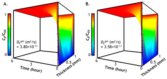 here, 3.80 × 10−11 m2/s and 3.58 × 10−11 m2/s were used to represent DEgel in a soft and stiff gel, respectively. If distributions of Tyrase in hydrogels with these two diffusivities show negligible differences within a relevant time scale, it can be safely assumed that the stiffening network only exhibits a minimal hindrance on enzyme transport. Equation (1) was solved numerically using the initial and boundary conditions listed in Section 3.3 [36]: