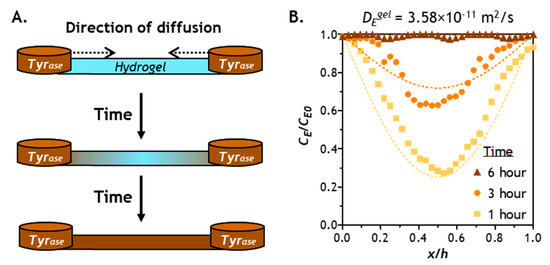 We used Fick’s second law of diffusion (Equation (10)) to estimate distribution of Tyrase in hydrogel over space and time: