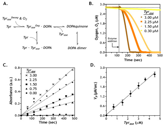 Evaluation of enzymatic reaction kinetics using Tyrase and l-Tyr: (A) steps of Tyrase-catalyzed DOPA dimer formation; (B) detection of oxygen content as a function of time and enzyme concentration; (C) quantification of DOPA formation using the MBTH assay (absorbance at 475 nm); (D) correlation of reaction velocity (VP) and Tyrase concentration.