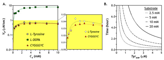 Effect of substrate concentration on Tyrase-mediated catalytic reaction: (A) reaction kinetics of Tyrase (0.6 µM) using different substrates (2–10 mM), including l-Tyr, l-DOPA, and peptide crosslinker (CYGGGYC)—kinetics of l-Tyr and CYGGGYC are highlighted in the right panel; (B) estimation of the time for Tyrase to convert all substrates into products.