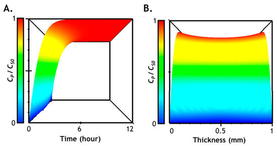 Prediction of time- and space-dependent enzyme-catalyzed product formation in a hydrogel: (A) viewing from the y-axis (time) in the 3D chart (time, space, and CP); (B) viewing from the x-axis (space) in the 3D chart. DEgel = 3.58 × 10−11 m/cm2, Tyrase = 3 µM.
