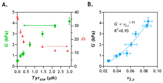 Correlation of hydrogel physical properties and enzyme concentration: (A) shear moduli (G’) and volumetric swelling ratio (Q) of hydrogel stiffened by different concentrations of Tyrase—all gels were initially crosslinked by thiol–norbornene photopolymerization using 2.5 wt% PEG8NB, 5 mM peptide crosslinker (CYGGGYC), and 1 mM photoinitiator (LAP); (B) correlation of the polymer volume fraction (v2,s) with G’ (N = 3, Mean ± SEM).