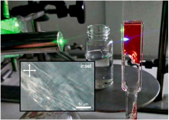 A photograph of 1,3:2,4-bis(3,4-dimethylbenzylidene) sorbitol (DMDBS)-palladium tetraphenylporphyrin (PdTPP)-9,10-diphenylanthracene (DPA) organogel in deaerated tetralin showing green-to-blue upconversion in an inverted cuvette. Adopted with permission from [33] Copyright 2015 Royal Society of Chemistry