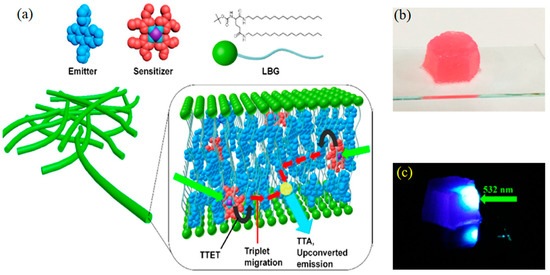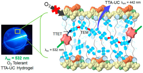 Weder and Simon et al. reported an upconverting organogel composed of N,N-dimethylformamide/dimethyl sulfoxide solution of Pd(II) mesoporphyrin IX (PdMesoIX) and DPA, and a three-dimensional polymer network of covalently cross-linked poly(vinyl alcohol) with hexamethylene diisocyanate (Figure 2a) [34]. The organogel showed a high TTA-UC efficiency (ΦUC´) of 14% under the deaerated condition, which is also ascribed to molecular diffusion of the donor and acceptor chromophores in the interconnected liquid compartments. The organogel was shown to exhibit the TTA-UC emission in air (Figure 2b), but its UC emission intensity was not stable under continuous excitation due to oxygen quenching. The addition of an oxygen scavenger in the liquid phase would improve the stability of the TTA-UC emission [35,36].