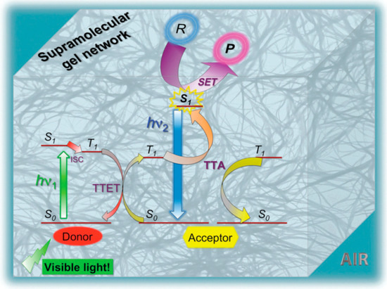The excited triplet state plays pivotal roles in a variety of photofunctional systems. The recent development of triplet-triplet annihilation-based photon upconversion (TTA-UC) has added emergent importance to photochemistry [1,2,3,4,5,6,7,8,9,10,11]. The TTA-UC typically occurs in multi-chromophore systems, which is initiated by triplet energy transfer (TET) from a photo-excited donor (sensitizer) to an acceptor (emitter) via an electron exchange (Dexter energy transfer) mechanism. When two sensitized acceptor triplets diffuse and collide, annihilation occurs to give a higher energy singlet state (S1), from which the delayed anti-Stokes fluorescence is emitted. Due to its ability to function at subsolar irradiance and a wide spectral window, the TTA-UC has attracted broad interest for applications, including a solar cell, photocatalysis, bioimaging, photodynamic therapy, and drug delivery [12,13,14,15]. Meanwhile, the excited triplet states are susceptible to deactivation by molecular oxygen (3O2) [16,17], and their protection from oxygen is an outstanding issue in triplet-related photochemical processes [18]. This holds true for TTA-UC, and it has been investigated by completely deaerating the solutions or solid materials followed by the sealing procedures. However, the use of such deaerated samples limits the potential of TTA-UC to be maximiszd in many applications. Therefore, the development of air-tolerant TTA-UC systems is highly desired. Various design principles have been developed to solve this issue, such as polymer coated micro/nanoparticles [19,20,21,22,23,24], acceptor molecular assemblies [25,26,27,28,29], and supramolecular gels. In this article, we highlight gel materials that are designed to achieve TTA-UC under ambient conditions.