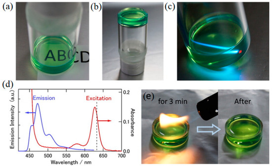 Murakami and coworkers reported TTA-UC in ionogels [41]. The TTA-UC ionogel was prepared by dissolving the UC dye pair of palladium meso-tetraphenyl-tetrabenzoporphyrin (PdPh4TBP), perylene, and a polymeric salt gelator in IL; 1-butyl-2,3-dimethylimidazolium bis(trifluoromethylsulfonyl)amide ([C4dmim][NTf2]) (Figure 6). TTA-UC occurred based on the molecular diffusion in the ionogels under deaerated conditions. The ionogel showed excellent stability against flame thanks to the excellent nonflammability of ILs (Figure 6e).