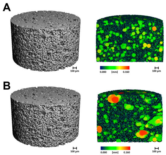 3D reconstruction images of (A) plain CG and (B) CG + MH. The grey figures display the 3D scaffolds whereas the sagittal cross-section displays the inner pore distribution, with pore size denoted by the color bar.