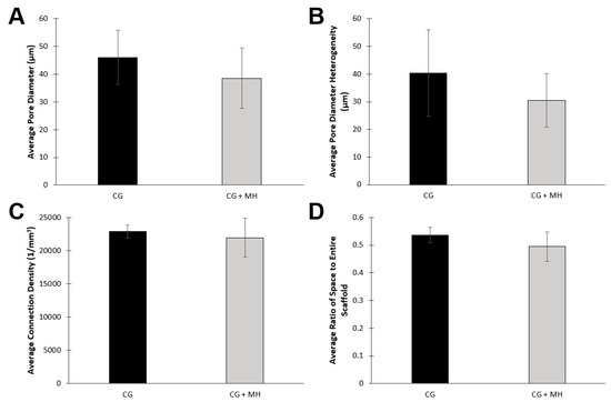 µCT analysis of the CG scaffolds (± MH) providing the average (A) pore diameter (µm), (B) pore diameter heterogeneity (µm), (C) connection density (1/mm3), and (D) ratio of space to entire scaffold. There was no significant difference between average pore diameter, pore heterogeneity, interconnectivity, and ratio of space to entire scaffold between either of the cryogel types (p < 0.05).
