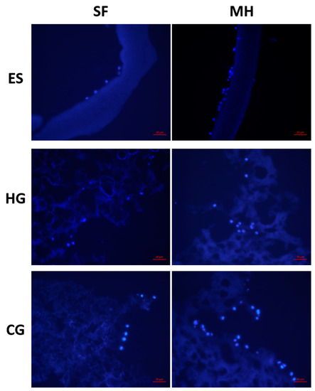 Cellular adhesion was used to demonstrate the cell compatibility with the various scaffold types. The ES, HG, and CG scaffolds (n = 3) were sterilized in peracetic acid for 90 min and then rinsed with sterile phosphate buffered solution (PBS) for 10 min, three times. Following sterilization, all scaffolds were placed in a 48 well plate (Falcon, Fisher Scientific UK Ltd, Loughborough, UK), surrounded by cloning rings (Fisher Scientific). 100 µL of 50,000 human bone osteosarcoma-derived cells (MG-63, passage 4; ATCC) suspended in DMEM with 4.5 g/L Glucosenand l-Glutamine, 10% FBS, and 1% penicillin-streptomycin was seeded onto each scaffold through the dropwise method, as described previously [38,46]. All scaffolds were then incubated for one hour at 37 °C and 5%, at which time an additional 300 µL of complete media was added to each well. The plates were placed in the incubator for an additional hour to allow for attachment. At this time, all scaffolds were moved to a new well-plate and rinsed with sterile 1× PBS twice, 5 min each, under mechanical agitation to ensure that any cells that had not adhered to the surface of the scaffolds were removed. All scaffolds were removed and immediately fixed in formalin (Fisher Scientific) for storage for at least 24 h. In preparation for sectioning, all scaffolds were soaked in 30% sucrose (Acros, Molinons, France) for 24 h, embedded in Tissue Freezing Medium (Triangle Biomedical Sciences, Fisher Scientific), and frozen at −80 °C overnight. The scaffolds were then cryosectioned at 20 mm and stained with 40,6-diamidino-2-phenylindole, dihydrochloride (DAPI, 98%; Acros). Images were taken by an optical light microscope (Zeiss, Axiovert 200) at 40×. Note that MG-63 cells were chosen due to their popularity in both hydrogel and cryogel tissue engineering applications to demonstrate basic adhesion and other cell types should be examined in future studies [19,47,48,49,50]. This early timepoint for adhesion was chosen as previous work has already examined later timepoints including 1, 4, 7, and 28 days [21,38]. As MH release has been shown to be highest in quantity during the first 24 h, this early timepoint was most appropriate for identifying the immediate effect on cellular interaction [23].