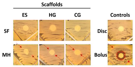 ES, HG, and CG scaffolds (± MH) were placed on plates of S. aureus for 24 h to measure both full and partial clearance. The controls include a sterile disc and bolus MH control. Partial clearance attributed to the MH is noted with red arrows while full clearance is circled in red. Note that clearance attributed to the water content of the scaffolds is not marked.