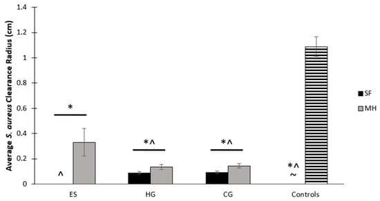 All scaffolds were placed on brain heart infusion (BHI) plates spread with S. aureus for 24 h (Figure 5). Both full and partial clearance of bacteria was measured from the scaffold to the ring of clearance, providing a measurement of the average clearance radius around the scaffold. The plain HG and CG scaffolds all had a small amount of clearance due to their water content; however, those containing MH had a wider partial clearance that spanned outside of the moisture ring (Figure 5 and Figure 6). The ES + MH scaffolds resulted in the most partial clearance (0.33 cm) and, as ES scaffolds are not filled with water, none of this clearance was attributed to moisture release (Figure 6). Specifically, ES + MH scaffolds had significantly more partial clearance than all other scaffolds and the disc control (p < 0.05). The sterile disc control exhibited no clearance, but the bolus of MH, with the largest full clearance of 1.09 cm, had significantly more clearance than all scaffolds and the disc control. Finally, HG, HG + MH, CG, and CG + MH all had significantly more partial clearance than the disc control (p < 0.05).