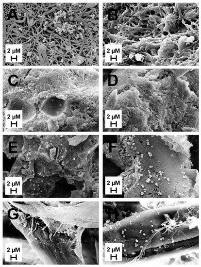 SEM images of bacterial adhesion for (A) plain ES, (B) ES + MH, (C) plain HG, (D) HG + MH, (E) plain CG, (F) CG + MH, (G) sterile disc control, and (H) vancomycin control. All images were taken at 15 kV with a scale bar of 2 µm.