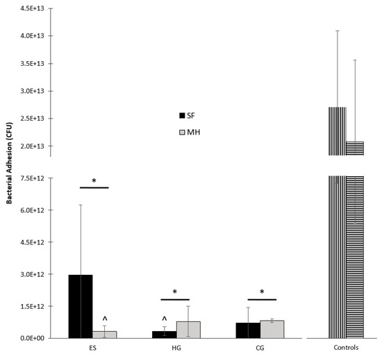 The adhesion of S. aureus to ES, HG, and CG scaffolds (± MH) and controls. Note that for the controls, vertical bars denote adhesion to the sterile disc and horizontal bars denote adhesion to the vancomycin disc. The sterile disc control had significantly more adhesion than all scaffolds (± MH), denoted by *. The vancomycin disc control had significantly more adhesion than ES + MH and HG scaffolds only, denoted by ^ (p < 0.05).