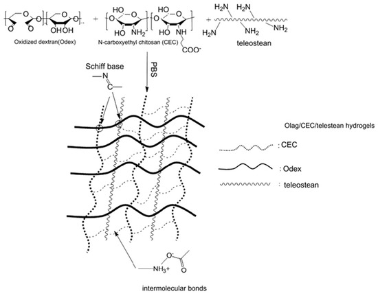 In 2011, Zhang et al. [14,15] reported the preparation of injectable triply interpenetrating network hydrogels [14] and monodispersed spherical microgels with a triply interpenetrating structure [15], both containing three different natural components: partially oxidized dextran (Odex) prepared by oxidation of dextran using sodium periodate (NaIO4), N-carboxyethyl chitosan (CEC) synthesized from the reaction of chitosan and acrylic acid (AAc), and Teleostean. The aqueous solutions of the three natural components at varying polymer concentrations were mixed together in an aqueous buffer solution of pH 7.4 in the order: first Odex, then Teleostean, and finally CEC at a constant Odex:Teleostean:CEC ratio of 2:1:1 in order to form the triply interpenetrating hydrogels. Figure 2 illustrates the chemical structures of the three components employed in the preparation of these hydrogels. CEC is an amphoteric natural polymer as it contains both ‒NH2 and ‒CO2H groups, Teleostean contains ‒NH2 groups, and Odex contains –CHO groups. Thus, Odex acts as a macromolecular cross-linker both for CEC and Teleostean through imine (Schiff base) bond formation. Hence, the triply interpenetrating hydrogels are cross-linked through both covalent Schiff base bonds and ionic interactions between the amine and the carboxylic acid groups. After their preparation, these hydrogels were evaluated in terms of their mechanical properties using burst strength testing. The triple hydrogels exhibited higher mechanical performance than their doubly interpenetrating hydrogel counterparts. Furthermore, increasing the concentration of the constituents led to increased mechanical performance of the final hydrogels, as increasing the number of the ‒NH2, ‒CO2H, and ‒CHO groups resulted in higher cross-linking densities.