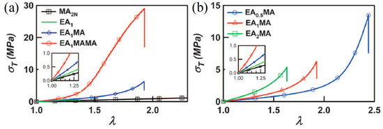 Mechanical behavior of the single network (SN), double-network (DN) and triple-network (TN) elastomers. (a) True stress–stretch curves for the EA1, EA1MA, EA1MAMA and PMA second network alone at 60 °C. (b) Effect of the cross-linker loading in the EA first network on the EAxMA DN elastomers. EA: ethyl acrylate; MA: methyl acrylate. Adapted and reprinted with permission from [17]. Copyright 2014 American Association for the Advancement of Science.