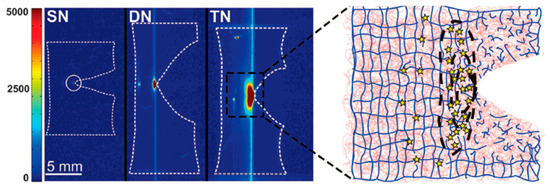 Mapping of location where bonds break during crack propagation. (Left) Intensity-colored images of propagating cracks on notched samples containing a chemiluminescence cross-linker in the first network, showing light emission due to breaking of bonds in the single-network (SN), double-network (DN), and triple-network (TN) samples. (Right) Schematic of the sacrificial bond-breaking mechanism in front of the crack tip for the DN and TN; the first network is represented in blue, and the second and third networks are in red. Adapted and reprinted with permission from [17]. Copyright 2014 American Association for the Advancement of Science.