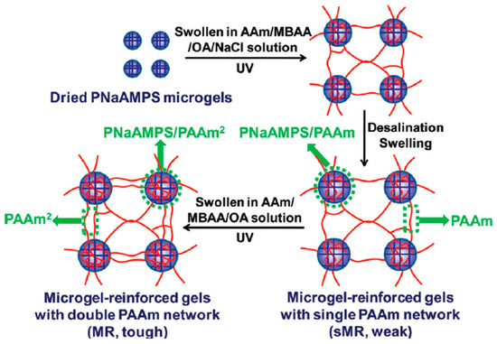 In 2011, the research group of Gong [19,20] reported the preparation of TN hydrogels consisting of microgels as the first component, and loosely cross-linked PAAm networks as the second and third components. Five different monomers were employed in the preparation of the microgels. These were AAm, SAMPS, sodium 4-styrenesulfonate (NaSS), 2-(trimethylamino)ethyl acrylate, chloride quaternary salt (DMAEA-Q), and 3-(acrylamidopropyl)-trimethylammonium chloride (DMAPAA-Q). For each monomer, a different microgel was prepared, and, from that, the corresponding DN and TN hydrogels were formed. The preparation of the five different TN hydrogels was accomplished through three steps. Figure 6 illustrates the synthetic route for the preparation of the PSAMPS/PAAm/PAAm TN hydrogels. After their preparation, the microgel precursors were allowed to reach swelling equilibrium in an aqueous solution of AAm, containing MBAAm and OXG photoinitiator, and after their photopolymerization, they were again allowed to reach swelling equilibrium in an aqueous solution of AAm, MBAAm, and OXG, and photopolymerized in order to obtain the final TN hydrogels. The evaluation of the TN hydrogels in terms of their mechanical properties using tensile measurements indicated values of fracture stress, fracture strain, and Young’s modulus for the PSAMPS/PAAm/PAAm TN hydrogels similar to those of the conventional PAMPS/PAAm DN hydrogels. In the next report [20], these authors investigated the dependence of the mechanical properties of the PSAMPS/PAAm/PAAm TN hydrogels on several parameters, such as the concentration of the microgel, the concentration of sodium chloride in the second network, the concentration of AAm in the second and third networks, and the concentration of MBAAm in the second network. Increasing the concentration of the microgel or the concentration of AAm in the second and third networks and, therefore, the molar ratio of PAAm to PSAMPS, resulted in great improvement in the mechanical properties of the final TN hydrogels.
