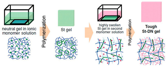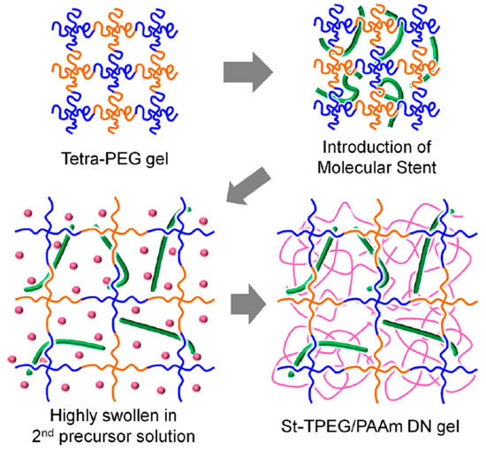One year later, again Gong’s research group [22] developed TN hydrogels consisting of a well-defined first polymer network, a linear PAMPS molecular stent chain as the second component, and a loosely cross-linked nonionic PAAm network as the third network, as shown in Figure 8. The first polymer network was obtained from the reaction of a tetra-amine-terminated four-arm poly(ethylene glycol) (TAPEG) star polymer with an activated tetra-ester-terminated four-arm poly(ethylene glycol) (TNPEG) star polymer. In order to induce a higher osmotic pressure, and, consequently, a higher degree of swelling in the first network which was well-defined, the first network was immersed in an AMPS monomer solution and was UV-irradiated to obtain a DN hydrogel. This DN hydrogel was subsequently immersed in an AAm monomer/MBAAm cross-linker solution, and was also UV-irradiated to prepare the final TN hydrogel. Furthermore, the corresponding PAMPS/PAAm and TPEG/PAAm DN hydrogels were also prepared, in order to perform the comparison between the three types of hydrogels. Characterization of the obtained hydrogels in terms of their mechanical behavior using tensile experiments indicated the superior mechanical properties of the TN hydrogels in comparison with the TPEG/PAAm DN hydrogels without the stent, and the conventional PAMPS/PAAm DN hydrogels.