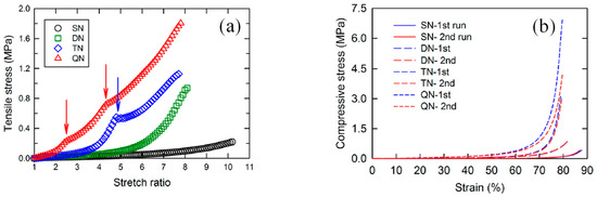 In 2016, Shams Es-haghi and Weiss [28] reported the preparation and characterization of nonionic QN hydrogels. These hydrogels were based on AAm monomer and MBAAm cross-linker, while all four PAAm networks were prepared using a relatively high monomer concentration, 4 M, and a very low MBAAm cross-linker concentration (0.01 mol% relative to the monomer), in order to achieve high extensibility and allow for tensile measurements. The thus-prepared SN, DN, TN, and QN hydrogels were characterized in terms of their mechanical properties using both compression and tensile measurements. The tensile measurements indicated high stretch ratios at break for all network multiplicities, but with the SN and DN hydrogels displaying higher stretch ratios at break (1020% and 820%, respectively) as compared to those presented by the TN and QN hydrogels (around 780%). The same tensile measurements also indicated that the fracture stress in tension increased as network multiplicity increased, with values spanning the range from 0.2 MPa for the SN to 1.8 MPa or more for the QN (this sample slipped out of the clamp fixture during the measurement and did not break). A similar trend was observed in the case of the compression experiments. Increasing the network multiplicity led to increased fracture stress values, from ~0.5 MPa for the SN to ~7 MPa for the QN hydrogel, and decreased fracture strain values, from 88% for the SN to 78% for the QN hydrogel. Figure 10 displays the tensile stress-strain curves (Figure 10a) and the compressive stress-strain curves for the SN, DN, TN, and QN hydrogels (Figure 10b). One and two kinks were observed in the curves of the TN and QN hydrogels, respectively, indicating strain localization during tensile deformation. No network damage occurred if the hydrogel was unloaded before the (first) strain localization point. In contrast, large hysteresis was observed if the hydrogel was unloaded after strain localization, manifesting in irreversible energy dissipation arising either from the breaking of cross-linked clusters formed as a result of the high network multiplicity or from the movement of cross-link junctions in the loosely cross-linked networks during deformation.
