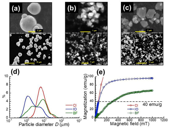 SEM photographs for (a) carbonyl iron, (b) iron oxide, and (c) barium ferrite particles. (d) Particle diameter distribution and (e) magnetization curves for these magnetic particles.