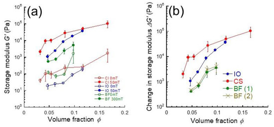 Figure 3a demonstrates the relationship between the storage modulus and volume fraction of magnetic particles for carrageenan magnetic hydrogels containing CI, IO, and BF particles. Both storage moduli with and without magnetic field at the beginning below 120 s in Figure 2 were used. All magnetic gels demonstrated that the storage modulus at 0 and 50 mT (or 300 mT) increased with the volume fraction of magnetic particles. The volume fraction dependence of storage modulus for magnetic fluids of spherical particles has been investigated by Martin and Anderson, de Vicente, or Ginder. All models showed the storage modulus is proportional to the volume fraction of magnetic particles [17,18,19]. There are also reports describing about the yield stress that it linearly increased with the volume fraction of magnetic particles at Φ < 0.2 for magnetic fluids of both carbonyl iron and Fe3O4 particles and it increased exponentially at higher volume fractions [20]. Volkova et al. reported that the yield stress for ferrofluids containing carbonyl iron particles increases with the volume fraction [21]. In this study, the storage modulus in the presence of magnetic field showed a power dependency as G’ ~ Φn at whole volume fractions, where the exponent n for CI, IO, and BF was determined to be 2.2, 4.0, and 3.3, respectively. Molchanov et al. was reported in the volume fraction dependence of storage modulus that there were two power-law dependences of G’ ~ Φ1.5 ± 0.1 at Φ < 0.01 and G’ ~ Φ2.1 ± 0.1 at Φ > 0.01 [22]. Similar dependencies, G’ ~ Φ2.5 ± 0.3 for medium fields and G’ ~ Φ2.2±0.4 for high fields, were observed for submicron magnetite particles suspended in silicon oil containing polyethylene at Φ < 0.05 [23]. In our study, only CI particle was in good agreement with these values. It might be that the exponent for aggregative particles takes high values compared to that for randomly dispersed particles.