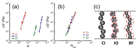 Figure 4a shows the change in storage modulus due to the magnetic field as a function of the number of magnetic particles for carrageenan magnetic hydrogels with CI, IO, and BF particles. The number of magnetic particles N was calculated from the following equation: