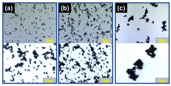 Microphotographs for magnetic particles in carrageenan hydrogels: (a) carbonyl iron, (b) iron oxide, and (c) barium ferrite particles (Φ = 5 × 10−3, carrageenan concentration: 0.8 wt %).