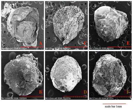CS and CS/HNTs hydrogels were dropped into 10% tripolyphosphate (TPP) solution. The ionic cross-linking happened between the NH3+ site of chitosan and OH− site on TPP. After 10 minutes cross-linking process, spherical hydrogel beads were formed with an average diameter of 3.38 ± 0.28 mm. For SEM analysis of surface and structural features of the hydrogel beads, beads were pretreated by lyophilization. Due to the pressure changes in the vacuum chamber during lyophilization, some hydrogel bead formulations collapsed and lost their spherical shape. A low concentration of chitosan (3% CS, Figure 1A) was barely able to preserve its original spherical shape as the hydrogel walls collapsed. However, as the chitosan concentration increased, the hydrogel beads structure provided some resistance to deformation and collapse of the hydrogel wall structure (Figure 1C,E). In contrast, the increased addition of HNTs may have enabled the CS/HNT hydrogels to resist deformation and preserve a more rounded microbead shape. HNTs may have interacted with chitosan to form stronger walls and provide more support to the hydrogel matrix. Also, the increased addition of HNTs produced a rougher surface (compare Figure 1D,F).