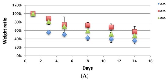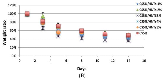 Biodegradability of CS and CS/HNTs in a lysozyme solution (1 mg/mL). (A). The weight ratio of hydrogel beads consisted of pure chitosan (3%–5%). (B). The weight ratio of hydrogel beads consisted of 5% CS with different ratios of HNTs (1%–5% wt./wt.).