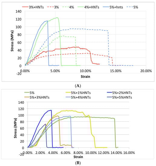 The stress-strain profile of CS and CS/HNTs. (A) Tensile test of pure chitosan (CS) with the HNT additive groups (CS/HNTs). In this graph, every CS/HNT compound has a higher stress value compare to CS group. (3% CS/2% HNTs > 3% CS, 4% CS/2% HNTs > 4% CS, 5% CS/2% HNTs > 5% CS). Simultaneously, a higher concentration of chitosan showed higher stress values (5% > 4% > 3%), however, the strain values displayed a different response (5% < 4% < 3%). (B) 5% CS/1% HNTs showed a major improvement in elongation, while 5% CS/2% HNTs showed the greatest improvement in strength. Increasing of number of HNTs gradually decreased its reinforcement ability, until at these concentrations (CS/HNTs (5% CS/ 5% HNTs), the nanocomposites was weaker and more fragile than pure CS. The step-wise failure behavior (slippage) at the end of each profile represents the fracture point of each specimen.