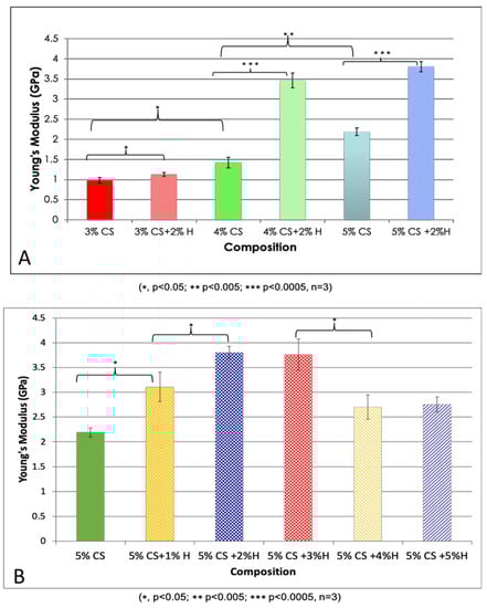 The Young’s modulus values were calculated according to the stress (σ) and strain (ε) values: Young’s modulus = stress/strain. Based on three repetitive measurements, the average values and standard deviation of Young’s modulus were calculated, and the differences were compared and are presented in Figure 4. Using a one-way ANOVA analysis, there was a significant difference in Young’s modulus among the different chitosan concentrations (p = 0.00002) supporting the conclusion that chitosan concentration is a crucial factor affecting Young’s modulus. In addition, HNT addition significantly improved the tensile strength of CS, (p = 0.038, 3% CS vs. 3% CS/2% HNTs; p = 0.001, 4% CS vs. 4% CS/2% HNTs; p = 0.00006, 5% CS vs. 5% CS/2% HNTs). However, increases in tensile resistance after HNT addition gradually decreased as the concentration of HNTs increased to 5%, there was a weakening in hydrogel material properties.