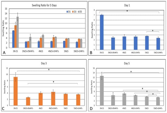 Swelling ratio for each hydrogel. The overall changes are presented in summary figure (A). The swelling ratio for Day 1, Day 3 and Day 5 (B–D, respectively). The symbol * indicates a significant difference (p < 0.05, n = 3). Error bar represents standard deviation.