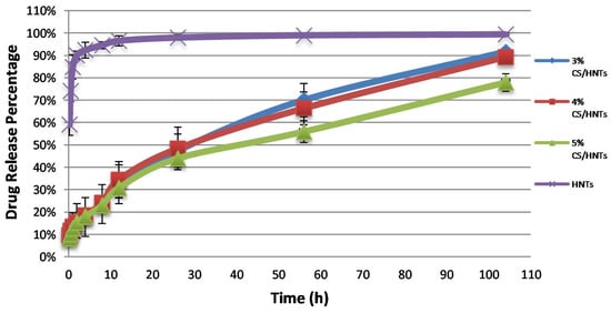 Gentamicin was selected as a model for drug release. The final drug loading efficiency of gentamicin loaded into HNTs was 13.96 ± 1.1%. The pattern of gentamicin release from the chitosan/HNT beads was used to validate what composition would serve optimally as a drug delivery system. As the results show in Figure 5, gentamicin released from HNTs had a burst release in the first 10 h, while CS/HNTs provided a more stable and extended drug release profile. According to one-way ANOVA analysis, there was no significant difference in drug release capability among 3% CS, 4% CS, and 5% CS at first 56 h, but at 104 h, there was a significant difference between them (p = 0.018), which indicates a higher concentration of chitosan could provide a longer drug release time.
