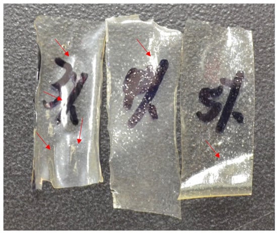 Picture for chitosan films after they were crosslinked and dried. The red arrows point to the wrinkles on the film.