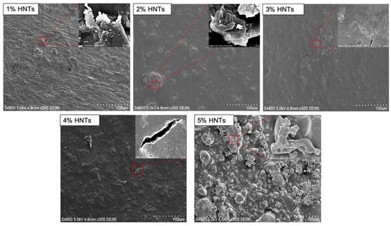 In this study, however, when HNT concentration exceeded an absolute value, hydrogel deformability decreased sharply. In this study, 2% wt./wt. combined ratio showed the best response to tensile testing. The results of degradation can also be explained along the same lines. The 2% wt./wt. HNTs-chitosan hydrogels also showed the slowest rate of degradation. Our observation of HNT response to deformability may be due to inadequate dispersion of HNTs in the chitosan matrix. [] The interfacial binding between HNTs and chitosan is achieved by hydrogen bonding and electrostatic interactions []. A uniform dispersion results in a uniform interfacial-binding matrix, which is favorable to force conduction. In contrast, too many nanotubes inhibit the dispersion state and create interfacial gaps, which are easy to break. This phenomenon is clearly presented in Figure 11: 5% chitosan combined with HNTs at different rations (1% to 5%), HNTs clusters were observed by SEM. The hydrogel films with higher concentration HNTs have bigger and more HNTs clusters. Those clusters resist the force conduction and may result in gaps, which is represented in the insert picture of Figure 11-4% HNTs. Instead of reinforcing the biomaterials, exceeded addiction of HNTs weakening biomaterials original mechanical properties.