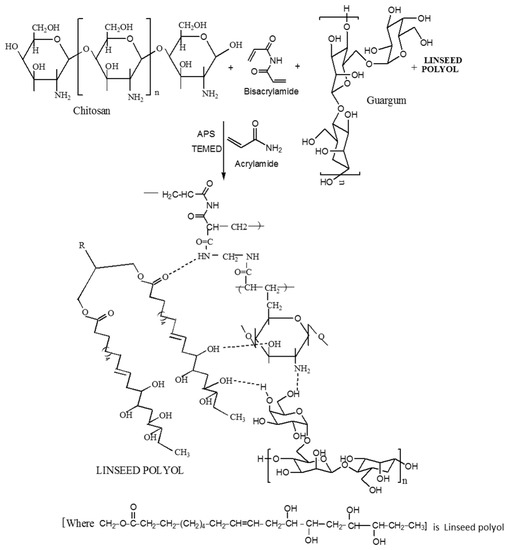 The reaction scheme showing the mechanism of formation of CH‒guar gum‒polyol hydrogels is presented in Figure 1.