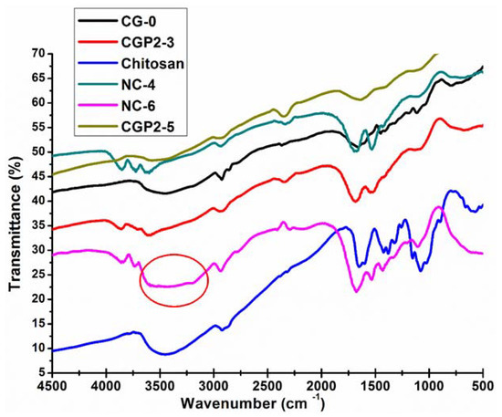 FT-IR spectra of pure chitosan, CG-0, CGP2-3, CGP2-5, NC-4, and NC-6 hydrogels.