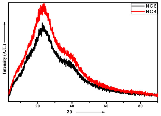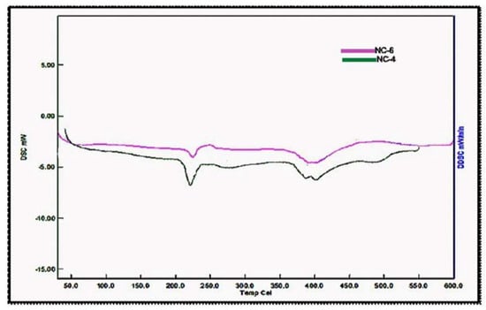 The DSC thermograms for NC-4 and NC-6 are depicted in Figure 8. The glass transition of NCHs was observed in the temperature range 53–95 °C. Furthermore, a more intense exothermic peak for NC-4 was observed at a slightly lower temperature (225 °C) in comparison to NC-6 (230 °C). This can be ascribed to the formation of an ordered structure due to more ordered interactions and high crosslinking in NC-4 as compared to NC-6, which is also evident from the XRD data. The DSC analysis of CG-0, CGP2-3, CGP2-5, and CGP2-7 is presented in Figure S3.