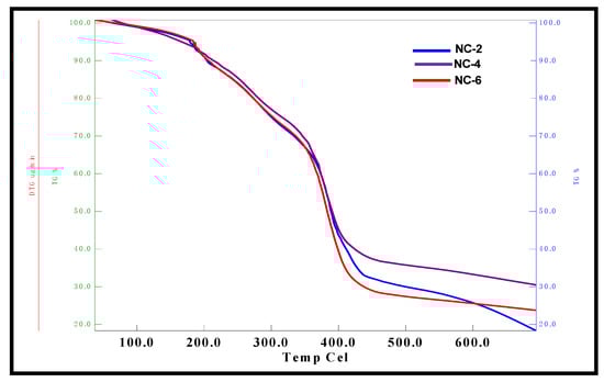 TGA micrographs of NC-2, NC-4, and NC-6 NCHs.