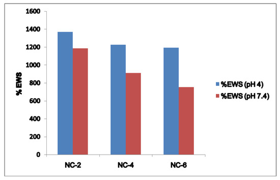 The equilibrium swelling behavior of the crosslinked NCHs hydrogels at 25 °C in pH 4 and pH 7.4 solutions is illustrated in Figure 9. The % EWS with the variation in pH of the NCHs constitutes an important parameter when designing a biomaterial for targeted DDSs.